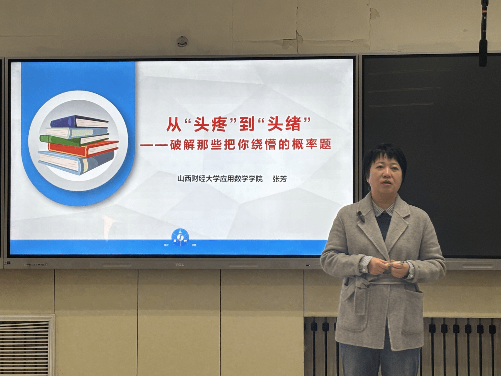 讲座中,张芳老师紧扣 “破解概率难题” 的核心,从学生普遍感到 “头疼” 的知识点切入,系统梳理了概率论课程中的重点、难点内容。她没有局限于理论讲解,而是结合生活实际与专业应用场景,将抽象的数学概念具象化、复杂的逻辑关系清晰化,帮助学生搭建起完整的知识框架。同时,针对学生关注的考研需求,张老师精选典型考研概率真题,深入剖析解题思路、方法技巧与易错点,引导学生掌握 “找头绪、破难点” 的解题逻辑,为备考学生提供了极具针对性的指导。整场讲座内容充实、重点突出,既夯实了基础,又强化了应用,有效破解了学生在概率学习中的困惑。