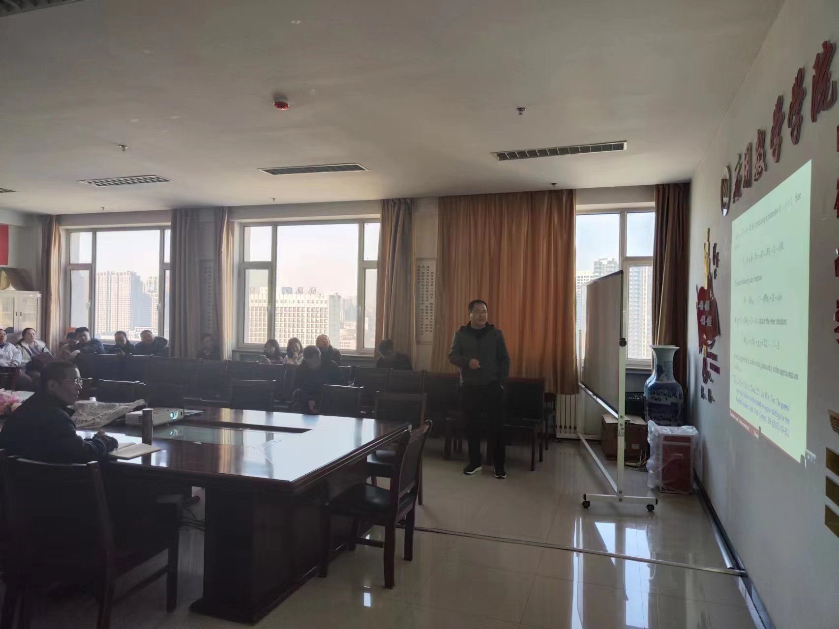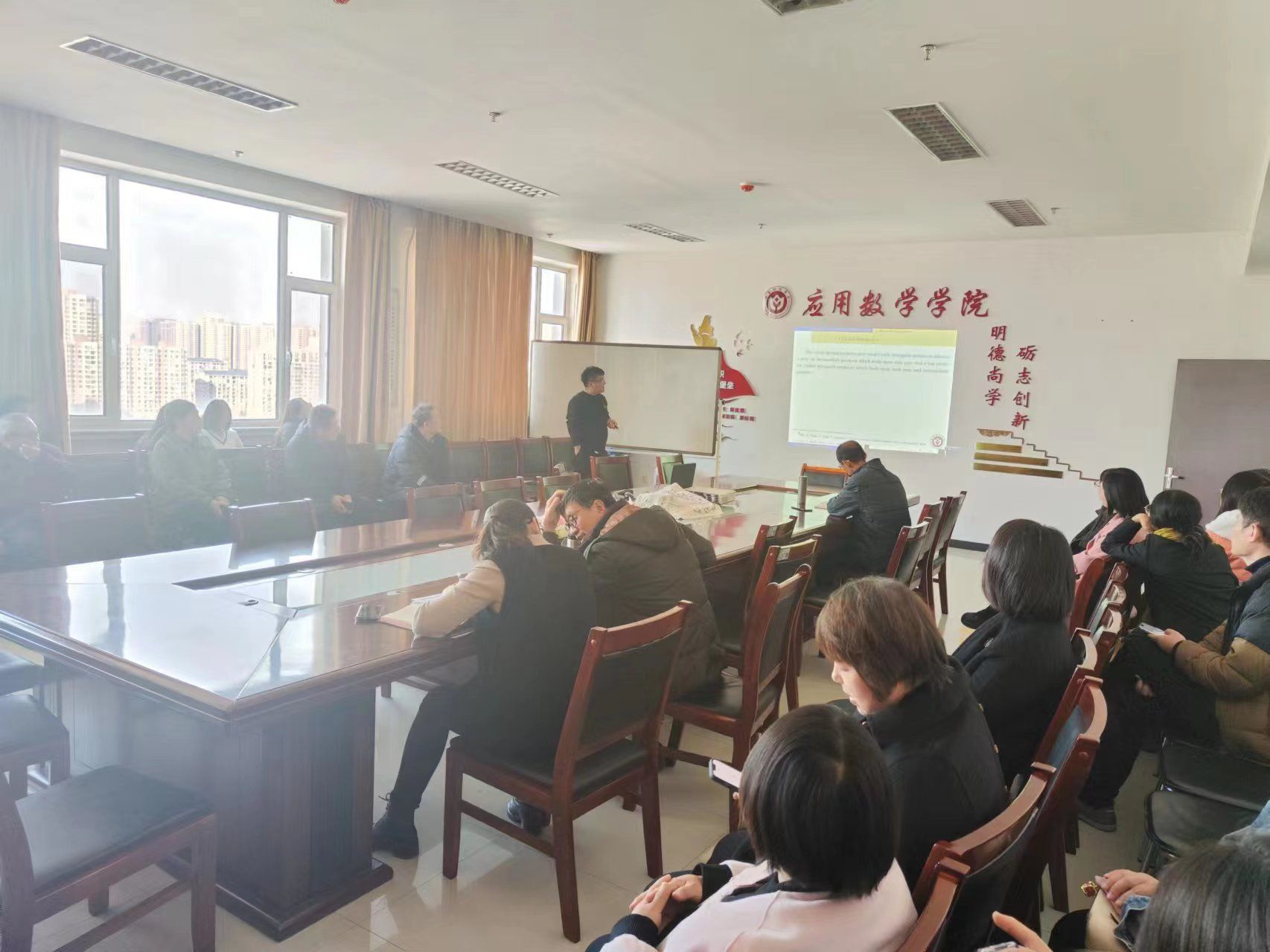 在学院会议室由刘荣副教授、田兆禄副教授分别做了关于“具有内捕食和多时滞的随机食物网模型的复杂动力学及最优收获问题”、“The inner-out iteration methods for solving the Sylvester matrix equations ”为题的两场学术报告。报告会由科研副院长武跃祥教授主持,我院全体青年教师积极参与了本次会议。