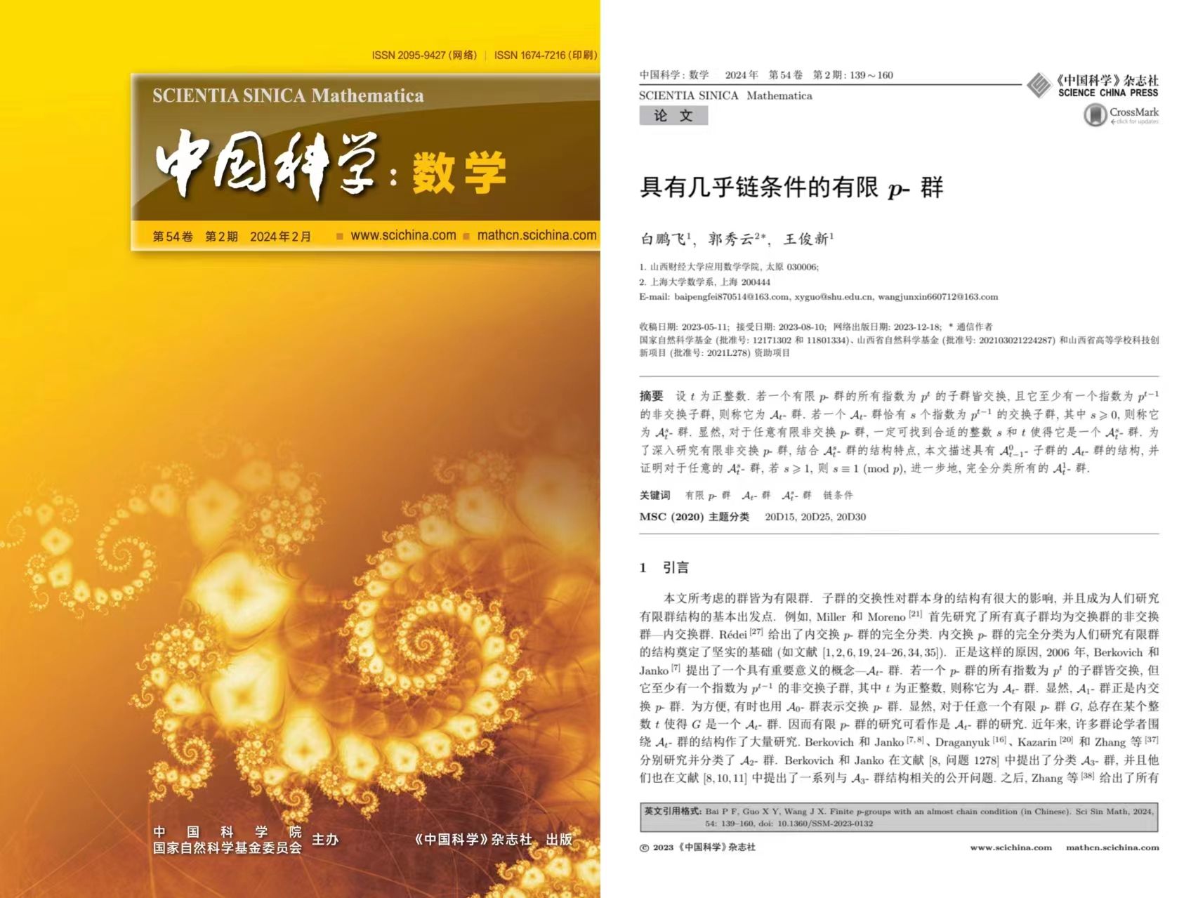 教师白鹏飞、王俊新的论文“具有几乎链条件的有限p-群”在《中国科学》2024年第2期发表(中国科学: 数学, 2024, 54(2): 139–160. DOI: 10.1360/SSM-2023-0132)。