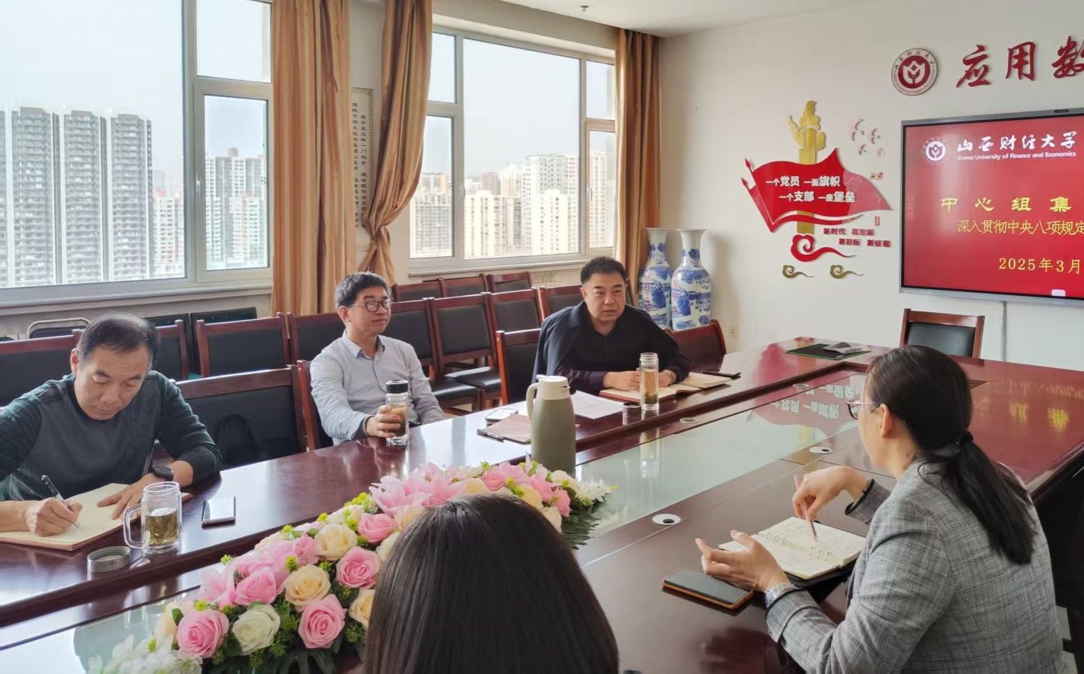 委员会《关于在全校开展深入贯彻中央八项规定精神学习教育的实施方案》(山财党〔2025〕19号),原文学习中央八项规定内容,围绕贯彻落实中央八项规定及其实施细则精神进行解读辅导,并对学院开展学习教育进行安排部署。学院党委书记秦春主持会议并讲话,党委全体委员参加了会议。