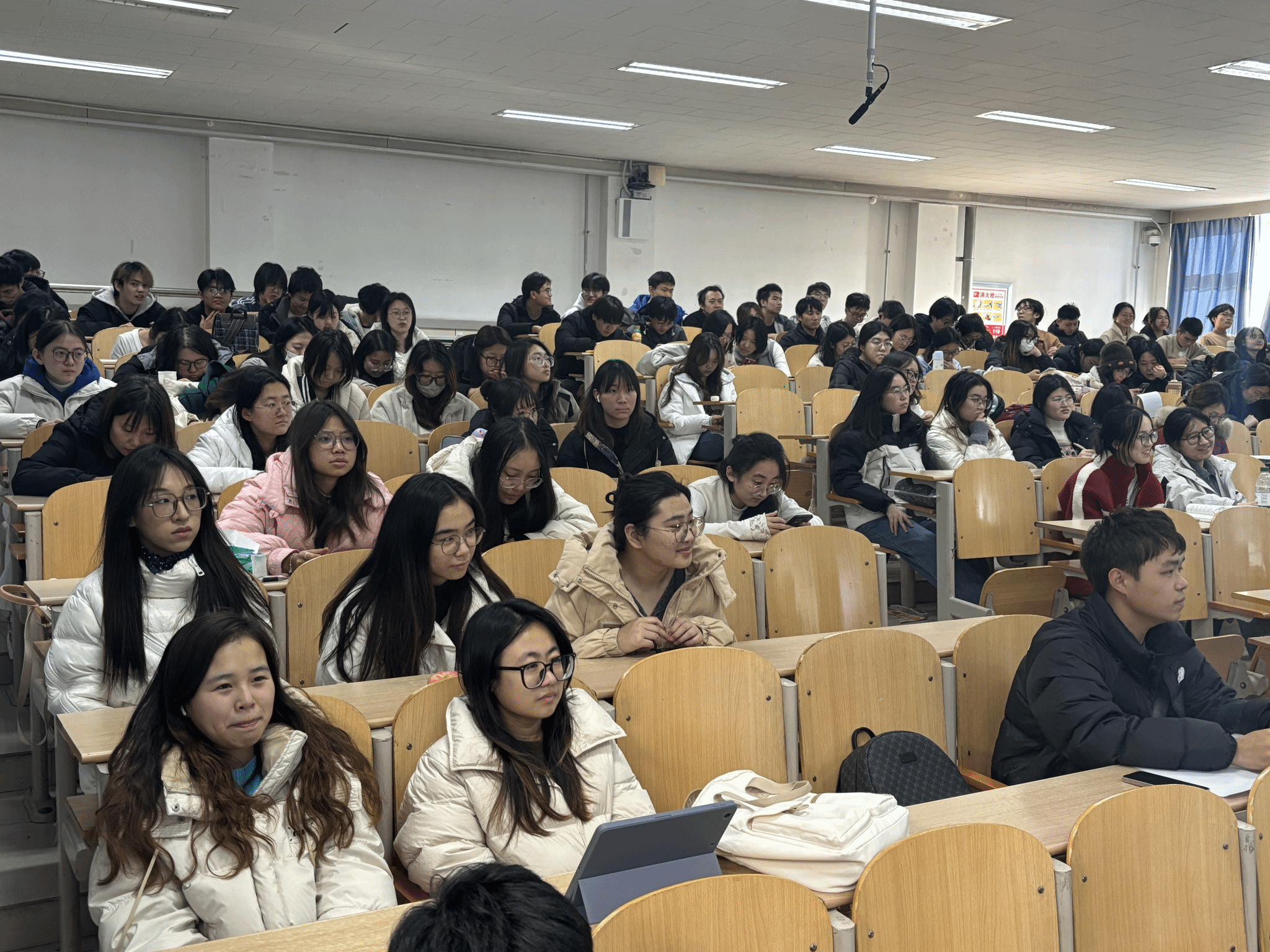 活动当天,讲座现场座无虚席,不仅原定座位全部坐满,不少晚到的学生更是主动站在会场两侧、后排全程聆听,现场学习氛围十分浓厚。讲座过程中,学生们专注投入,认真记录重点内容,在互动答疑环节,大家踊跃提问,张老师耐心细致地逐一解答,形成了良好的师生互动氛围。