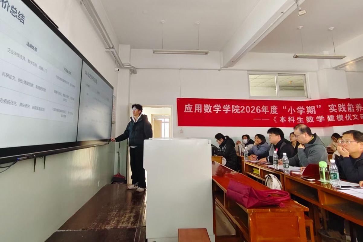 于2026年1月14日至17日精心策划并开展了“小学期”实践活动——《本科生数学建模优秀论文研读》。全院大二、大三60余名本科生积极参与、自由组队,经过为期四天的深入钻研与小组研讨,顺利完成此次实践任务,营造出比学赶帮超的良好氛围,取得了显著成效。