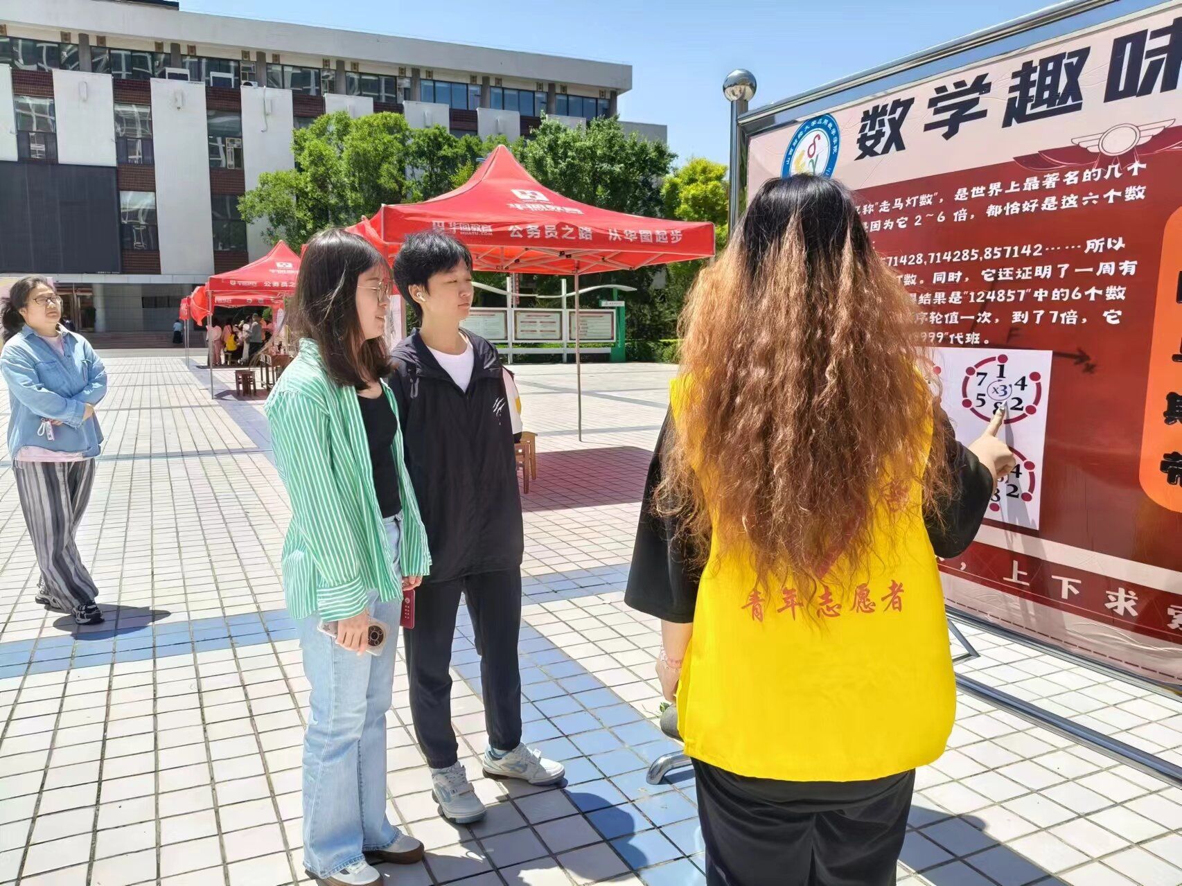 游园会以“观数学之美,体数学之妙”为主题,于5月26日在积雅楼广场举办。游园会划分为趣味数学知识科普区、数学游戏活动区和数学文化作品展览区三大板块。科普区依托7块精美的展板,学院志愿者向大家讲解莫比乌斯环、心形曲线、斐波那契数列等数学知识,以融会贯通的方式向同学们传播数学之美。在游戏区,速算一条龙、数学猜谜、汉诺塔、华容道、数独、九连环等内容丰富、形式多样的数学游戏吸引了众多同学,趣味数字梗和三行诗也得到大家的积极参与。数学文化作品展览区向全校师生展出了本届优秀数学文化作品。